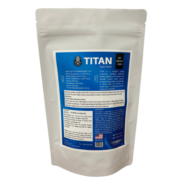 TITAN is a scientifically formulated microbial powder consortium designed to promote clear, balanced water in ponds, lakes, and streams. Harnessing the power of beneficial bacteria and enzymes, this product supports natural degradation processes to reduce organic buildup and excess nutrients.